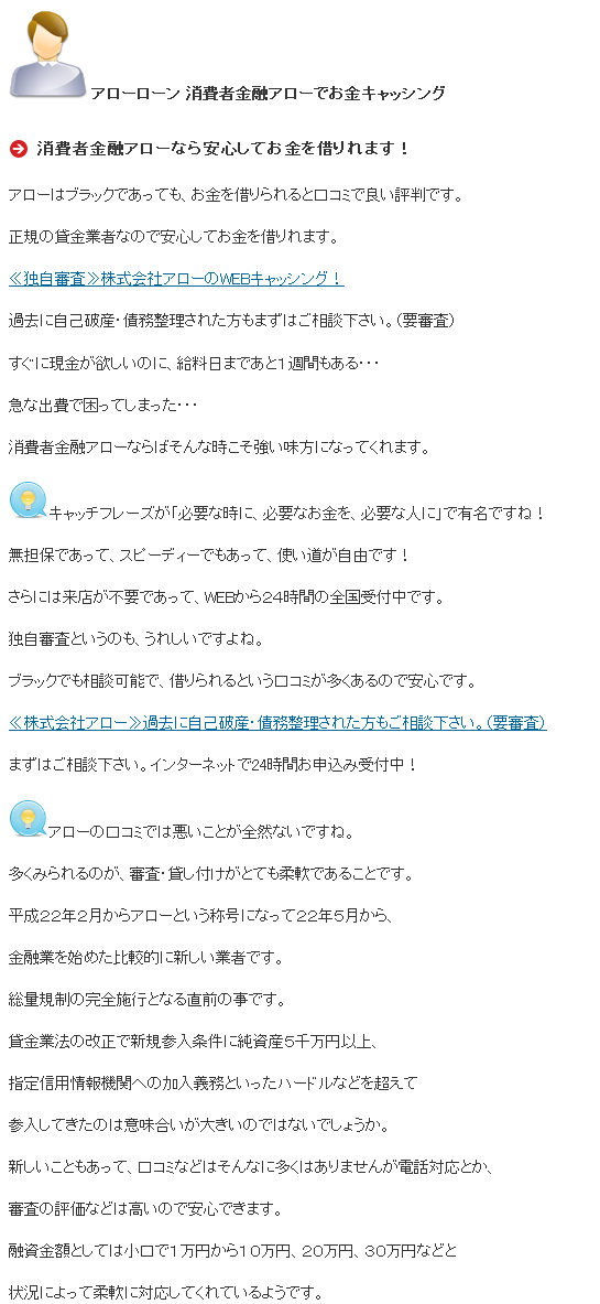 消費者金融アローは口コミに悪いものが無い評判の良い業者です。